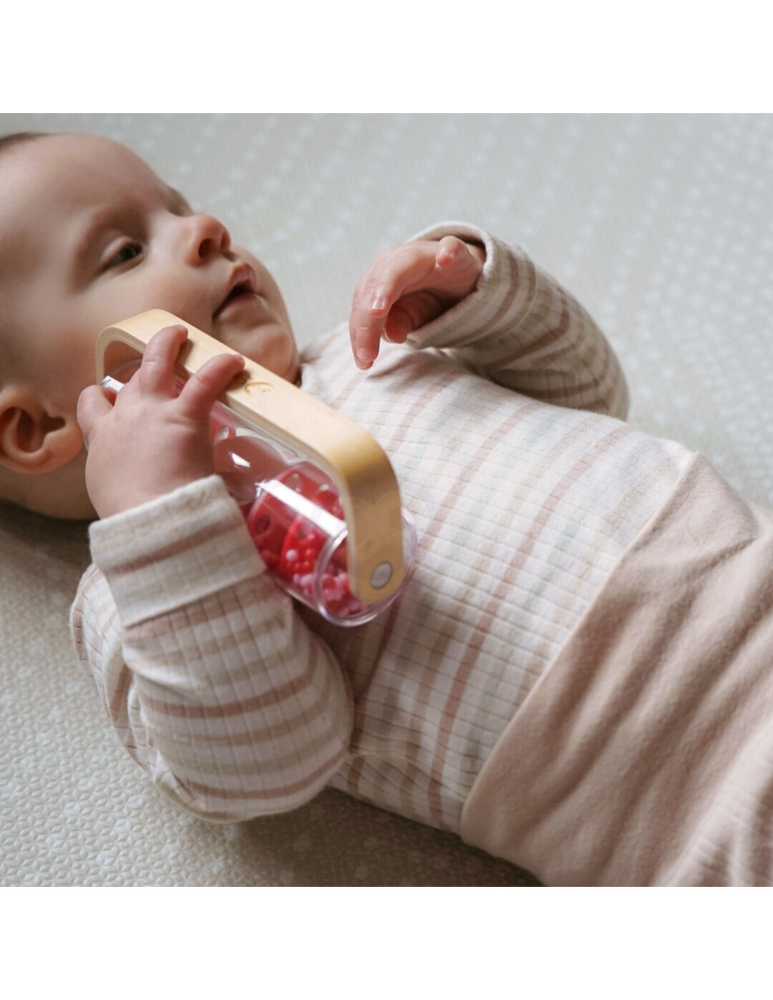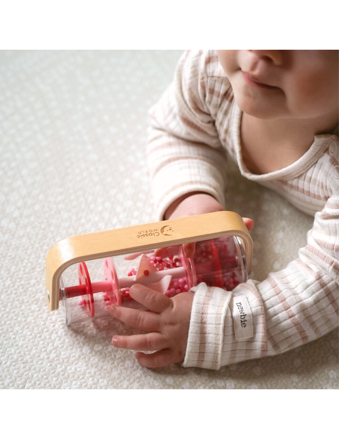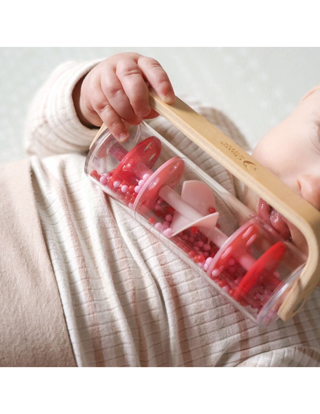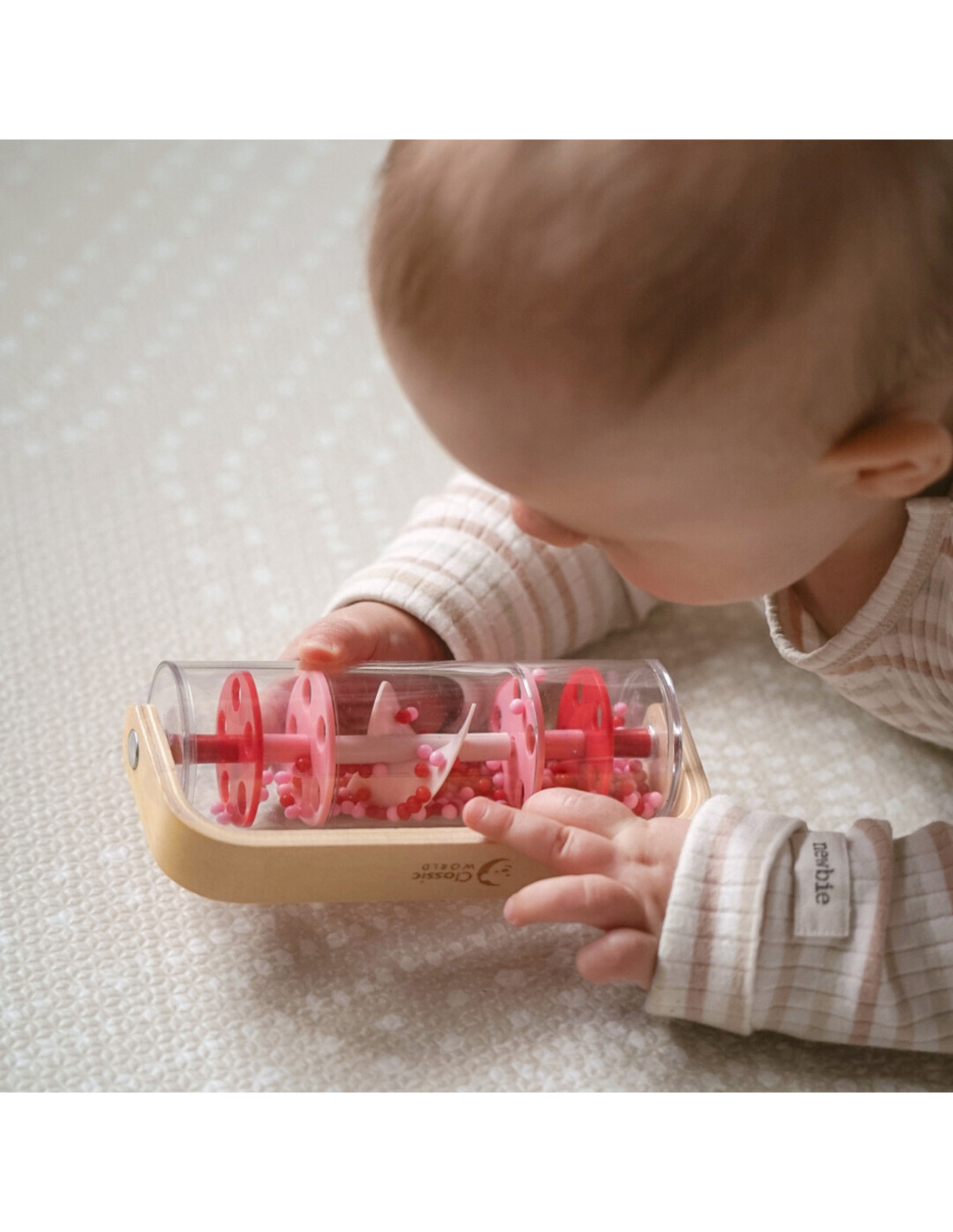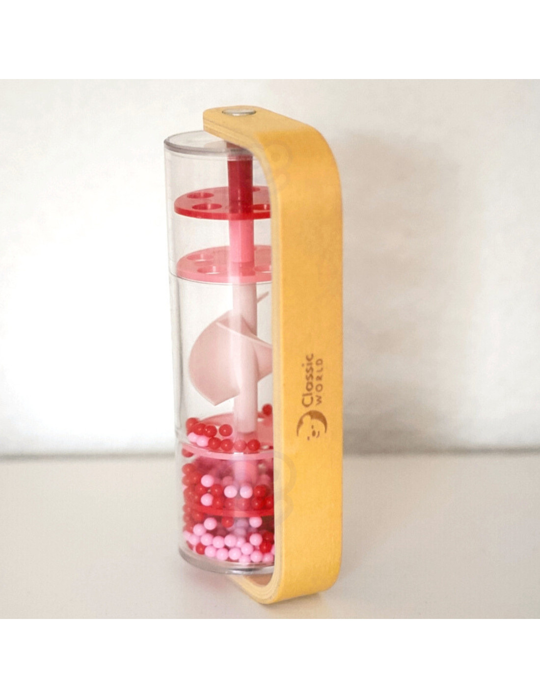 Dziecko może potrząsać, obracać i obserwować ruch kuleczek, rozwijając przy tym ciekawość świata.