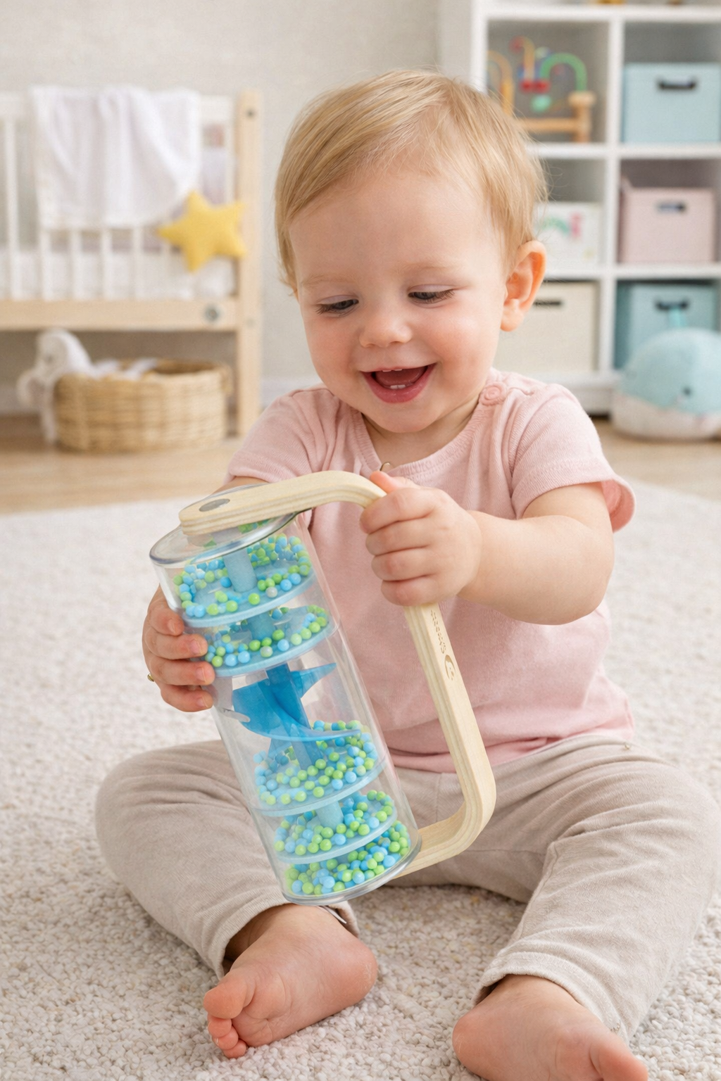 Dziecko może potrząsać, obracać i obserwować ruch kuleczek, rozwijając przy tym ciekawość świata.
