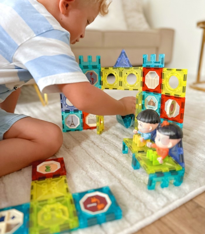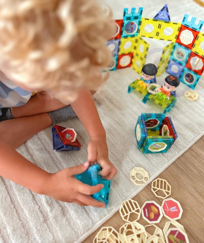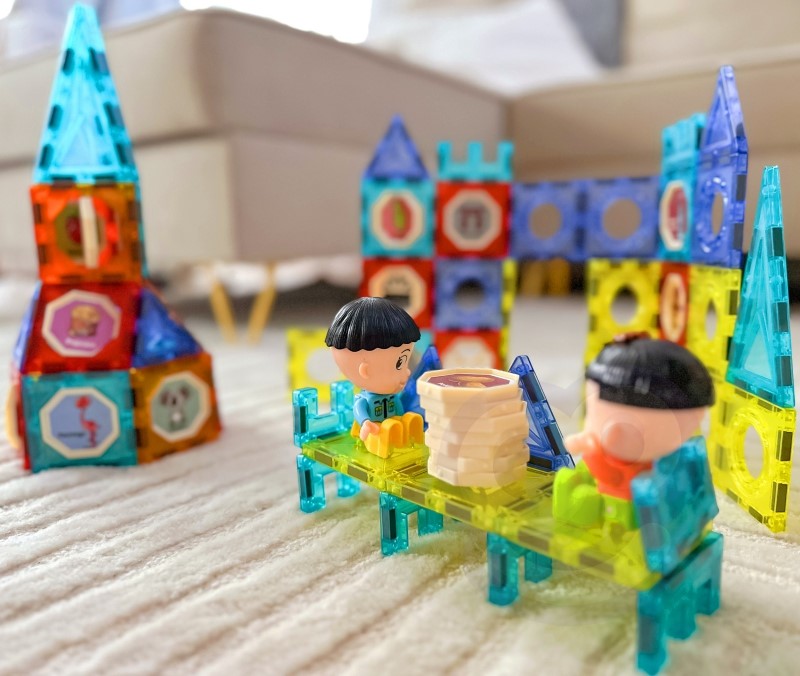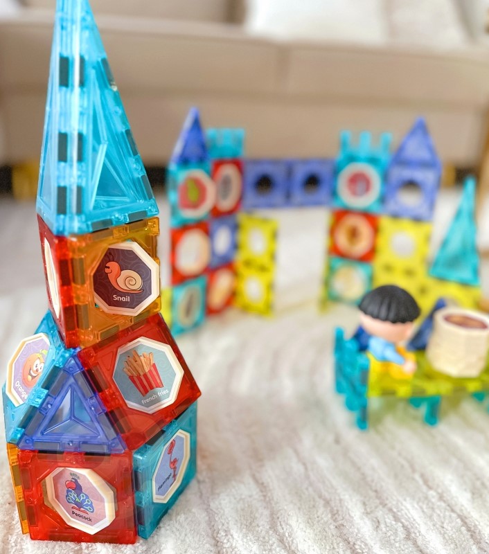Dzięki magnetycznym połączeniom elementy łatwo się łączą, umożliwiając budowę imponujących konstrukcji – w tym bajkowego zamku z wieżyczkami i murami.